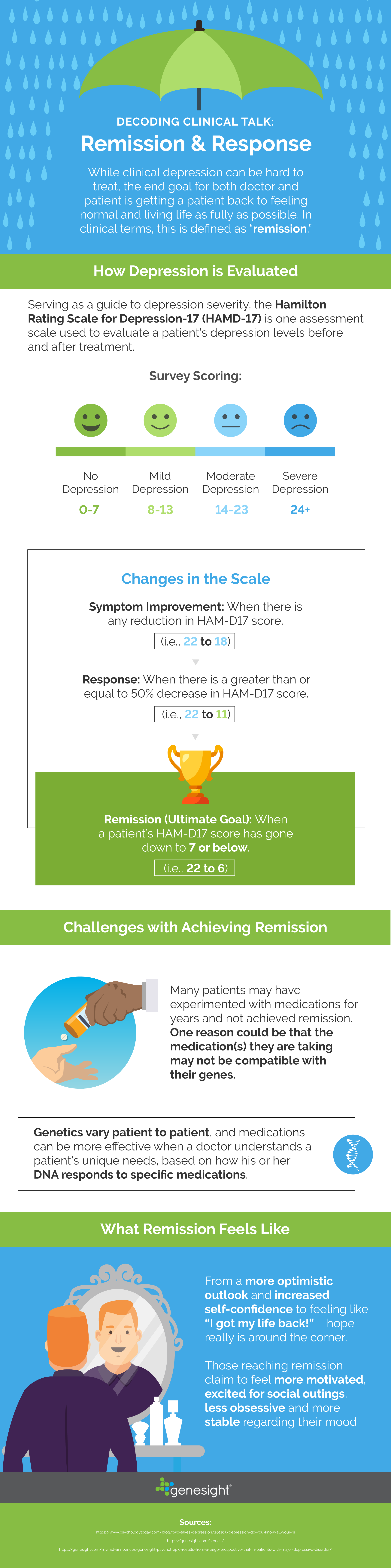 HomeGenetic InsightsDecoding Clinical Talk: Remission & Response Decoding Clinical Talk: Remission & Response May 7, 2018Genetic Insights Read what remission means to doctors and patients. Patient Break the resolution cycle: How simple solutions can transform 2026 Like every year, many of us make New Year’s resolutions and try to stick to them, but broad, all-or-nothing changes often set us up for failure and can make... Read more Patient Antidepressant Fatigue in Seniors: A Caregiver’s Guide to Reducing Daytime Sleepiness Without Losing Symptom Control You’re spending time with the older adult in your care who also happens to have clinical depression. You’re keeping tabs on how well they’re doing and wheth... Read more Patient Empowering Senior Patient Care with Pharmacogenomics: Insights from the GeneSight Engage Webinar The most recent GeneSight Engage webinar explored how pharmacogenomic testing, particularly the GeneSight® test, is transforming the landscape of mental health ... Read more Patient BIPOC (formerly Minority) Mental Health Month: Breaking Stigma, Building Trust Despite many efforts to stem it, stigma around mental health still exists, particularly in BIPOC (Black, Indigenous, and People of Color) communities. July mark... Read more Patient Long-Term Effects of Antidepressants: What Research Shows Anyone who’s ever taken antidepressants for an extended period of time has probably wondered whether they’ll experience long-term effects: After years ... Read more Patient Have a Mindful Summer: Take a Breather with These Simple Exercises Summer is a great time to kick back and relax—if you can find the time. Managing the hustle and bustle of kids off school, planning for fun summer activities an... Read more Patient Barriers at Every Turn: How Systemic and Social Factors Block Men from Mental Health Care Taking the important step of seeking care for mental health isn’t always an easy decision. Uncertainty about the need for care, social stigmas associated wi... Read more Healthcare Provider Overcoming Side Effect Concerns: Leveraging Pharmacogenomic Insights to Inform Depression and Anxiety Medication Selection Whitnee Brown, a lifelong resident now practicing in Birmingham, Alabama has nearly an entire alphabet following her name, abbreviations for degrees and certifi... Read more Patient Concerns about Mental Health Medication Side Effects Remain a Barrier to Getting Help for Those Diagnosed with Depression and Anxiety Lisa Roberts has raised a family, reached an impressively high level in her career, and was an anchor for her mother and other family members. When, within ... Read more Patient Common Antidepressant Side Effects Taking an antidepressant can be an effective way to help treat a mental health condition like depression or anxiety. However, these medications can also cre... Read more Learn more Learn more about GeneSight How to talk to your provider View our clinical studies